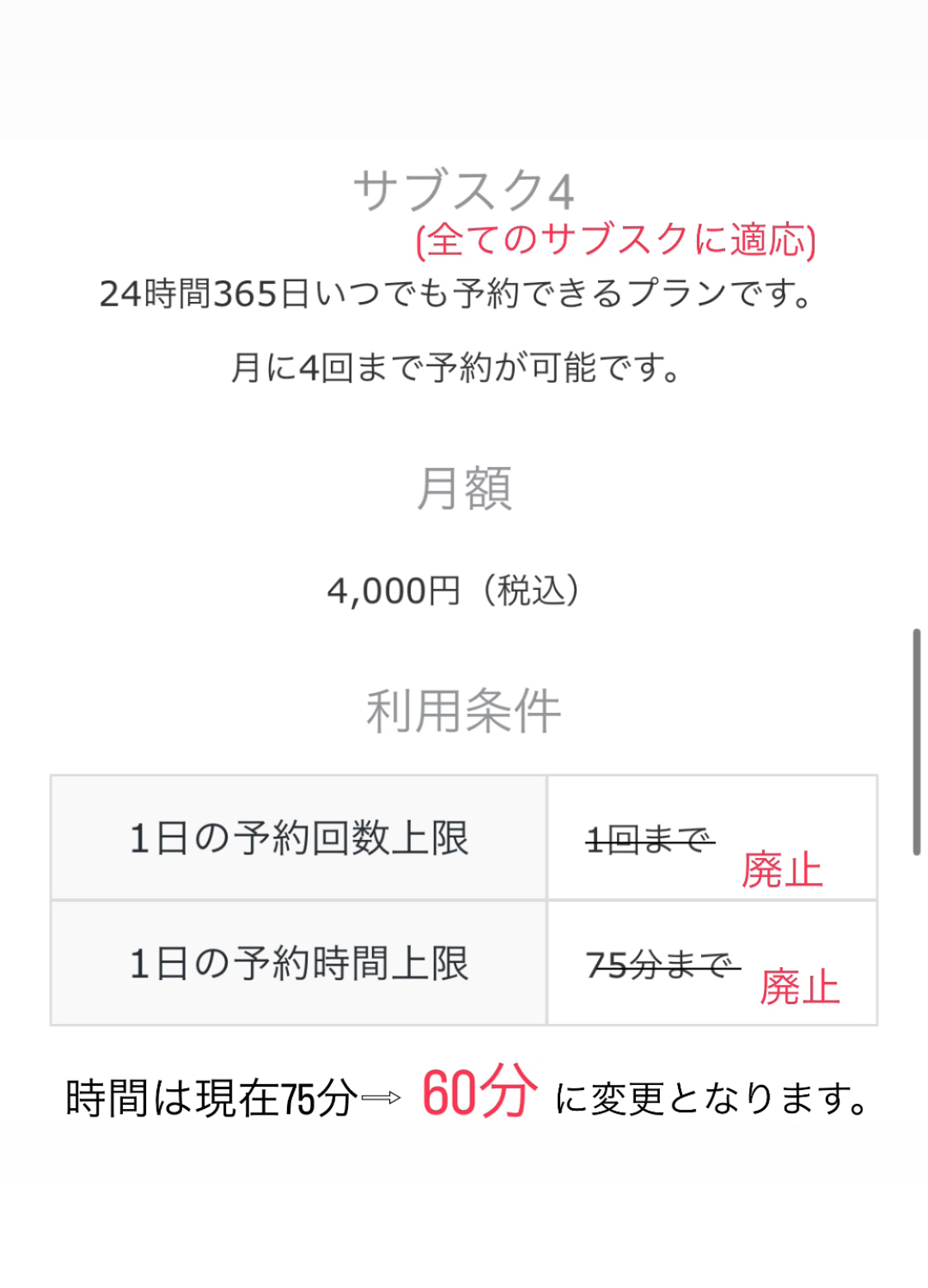 ・利用時間を75分→60分に変更。一日の予約上限時間、回数上限は共に廃止となります。以上が変更点となり、11月1日より適応となります事をご了承願います。今後ともレンタルジムリペアのご利用を宜しくお願いいたします。