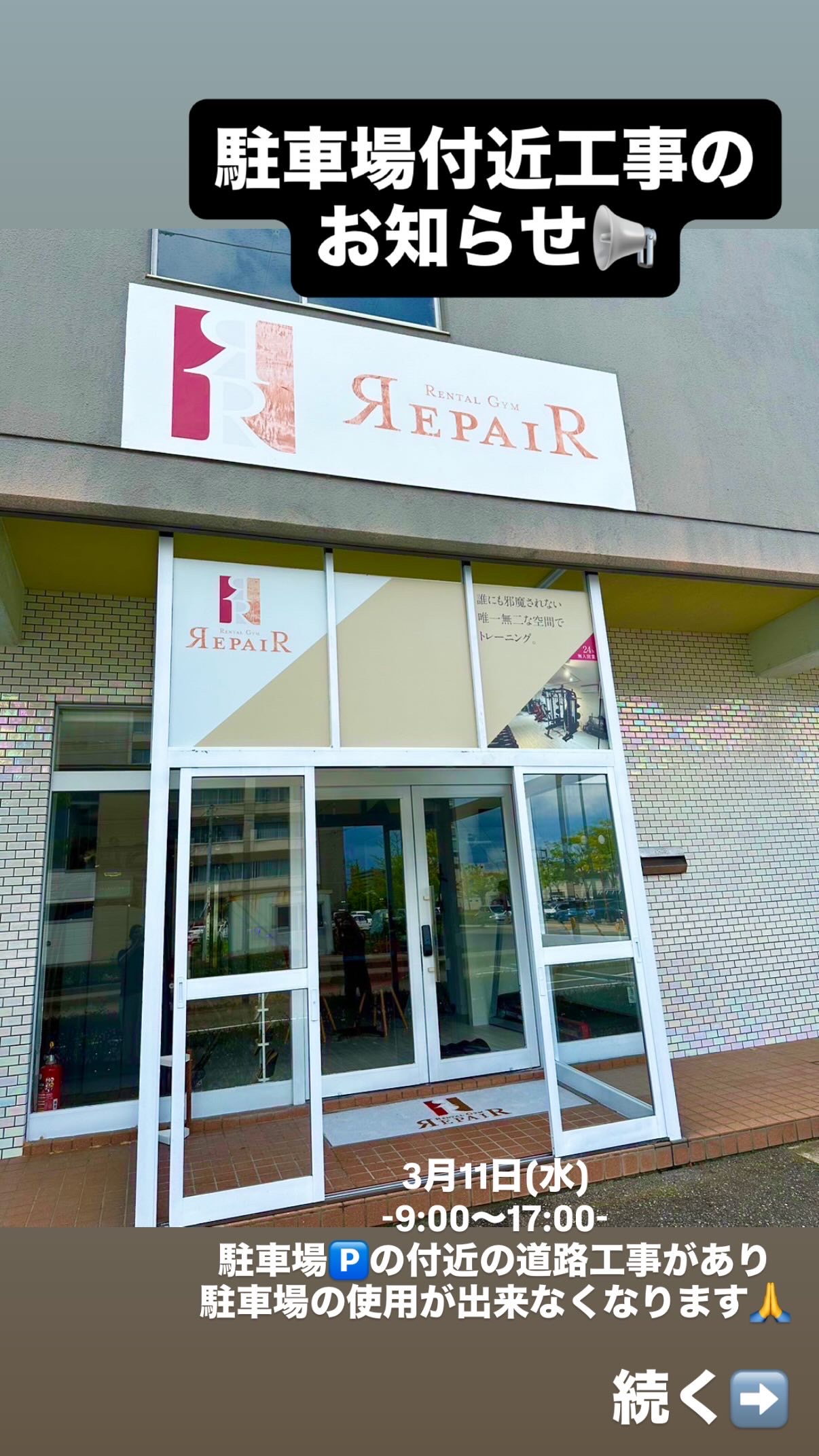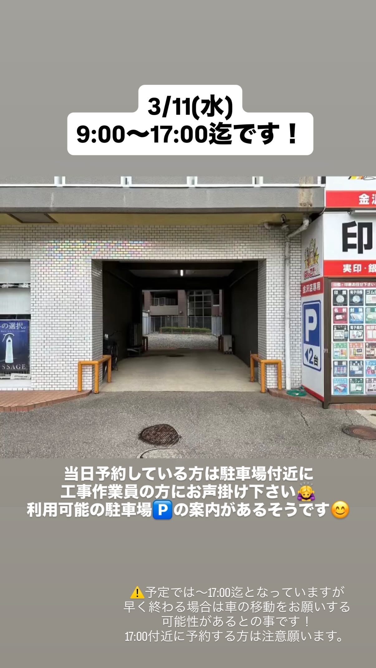 当日予約をしている方は駐車場付近に工事作業員がいるのでお声掛けください。利用可能の駐車場の案内があるそうです!また、予定では〜17:00迄となっておりますが、多少前後した場合は車の移動をお願いする可能性があるとの事です。17:00付近に利用される方は注意願います。